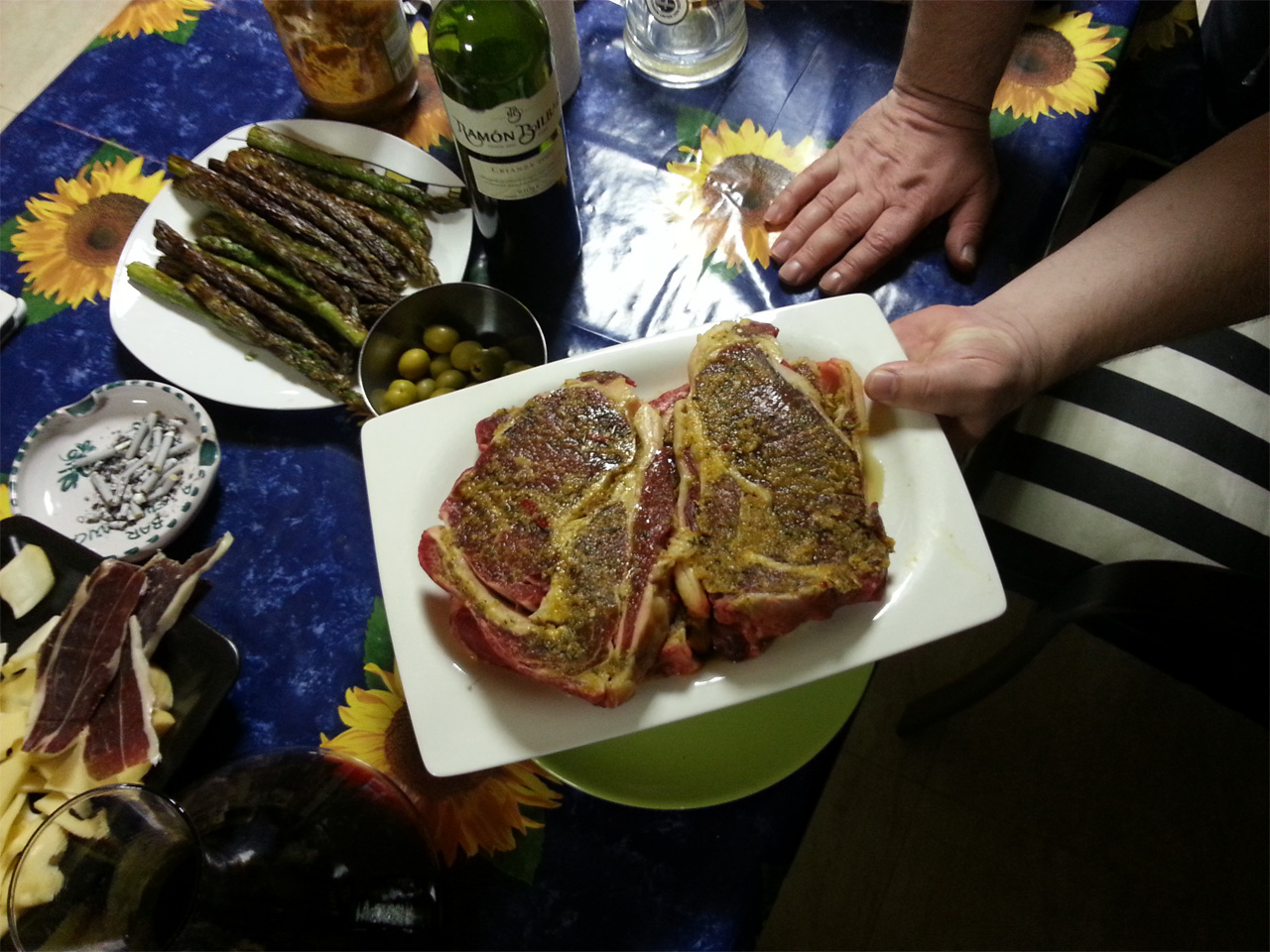 Первый правильный ужин на испанской земле. Офигенная спаржа (оказалось, что толстая зеленая спаржа намного вкуснее тонкой, просто ее нужно правильно жарить: в оливковом масле со специями на большом огне), оливки, хамон, правильное вино и правильные стейки с правильным соусом.