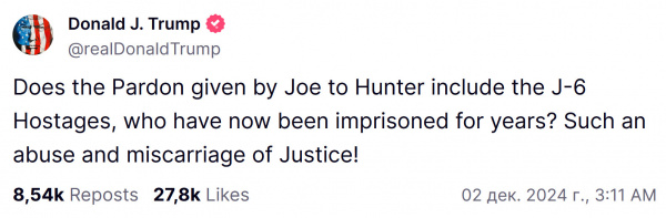 С Байденом это все особенно смешно - на фоне того, сколько раз он и его пресс-секретари заявляли, что президент никогда не воспользуется президентским правом помилованию в отношении его сынка, на котором клейма ставить некуда. Нет, ничего, воспользовался. Гуляй, рванина, терять-то все равно нечего.