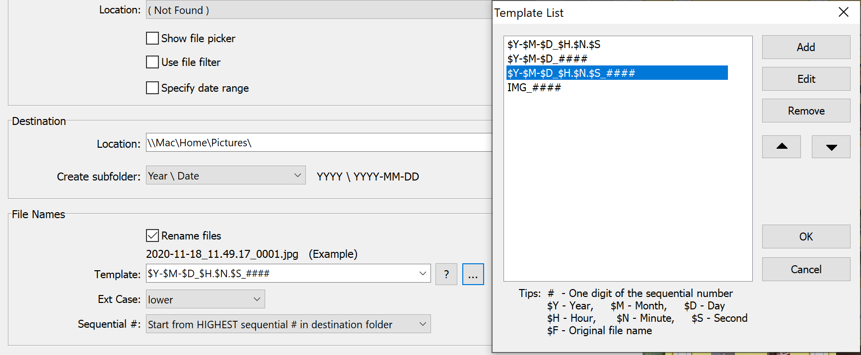 При необходимости задаем переименование файлов - например, по году, месяцу и дню.