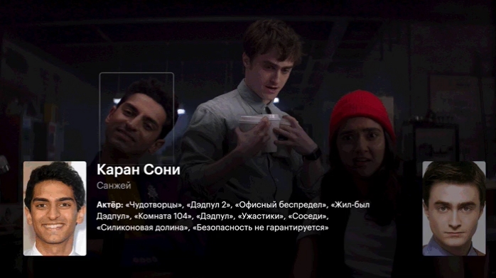 Чтобы выполнить распознавание, достаточно нажать на паузу. DeepDive моментально проанализирует изображение и покажет карточки с именами актёров, которые находятся в кадре. DeepDive определяет актёров в разном возрасте и даже в сложном гриме. Технология узнает Роберта Дауни-младшего как в первом «Железном человеке», вышедшем в 2008 году, так и в фильме «Мстители: Война бесконечности», который появился на экранах десять лет спустя. Или, например, безошибочно распознает Зои Салдану в зелёном гриме Гаморы в «Стражах Галактики».