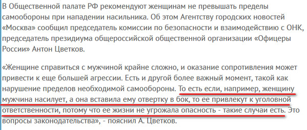 kondor2.0: Вчера наткнулся в радиоэфире, что журналисты дозвонились до этого Цветкова и спросили - что за... Он ответил - что он как раз таки выступает за то, чтобы женщина могла отбиваться от насильника всеми средствами, а сейчас закон устроен так, как он описал. И что увы, некоторых женщин, которые убили насильника, посадили.