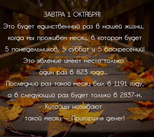 Между тем, легко видеть, что такая ситуация случается при выполнении двух факторов: когда 1 число приходится на субботу и когда в месяце 31 день. Это что - случается настолько редко? Да вон март 2014 года, например. Точно такой же, как и нынешний октябрь. Вспоминайте, приходила тогда пригоршня денег?