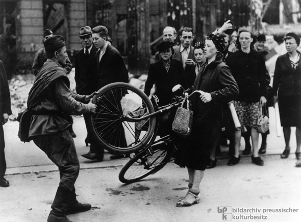 Помимо этого, история этого снимка, но в более "жестком" варианте (солдат просто отнимает велосипед у женщины), есть в книге двух авторов - имен сейчас не вспомню, но это гуглится.