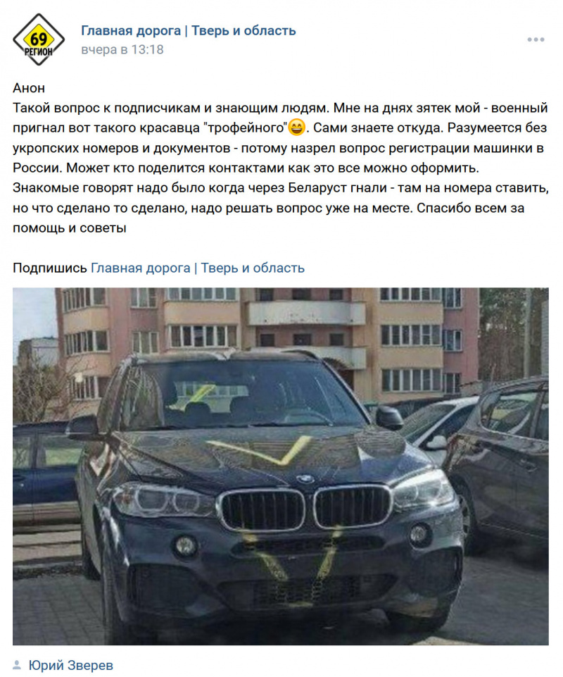 Интересно, посоветуют ему, как сворованную в Украине машину без номеров зарегистрировать? Посоветуют, я думаю. И в ГАИ зарегистрируют, почему нет? Денег дадут кому надо - и будет Юрий Зверев рассекать на тачке, которую ему зятек с войны пригнал.