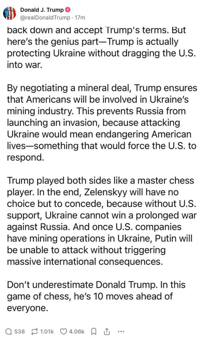 "Разработку металлов для нас" - это то, что бейс Трампа понять могет. И закрыть глаза на продолжение помощи Украине.