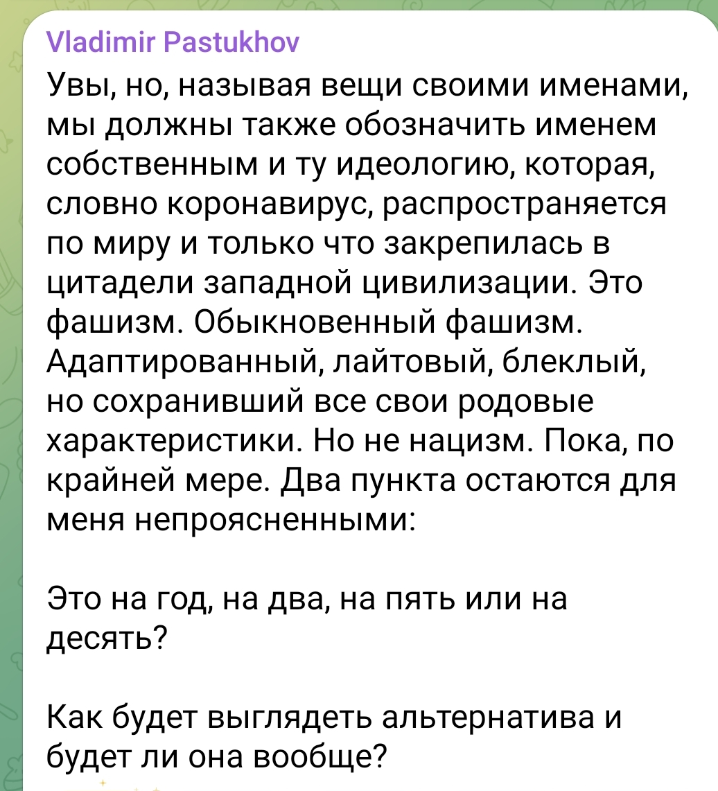 Кстати уважаемый Владимир Пастухов на своём последнем видеовключении пояснил, что Трампа никаким фашистом не считает и имел в виду совершенно другое.