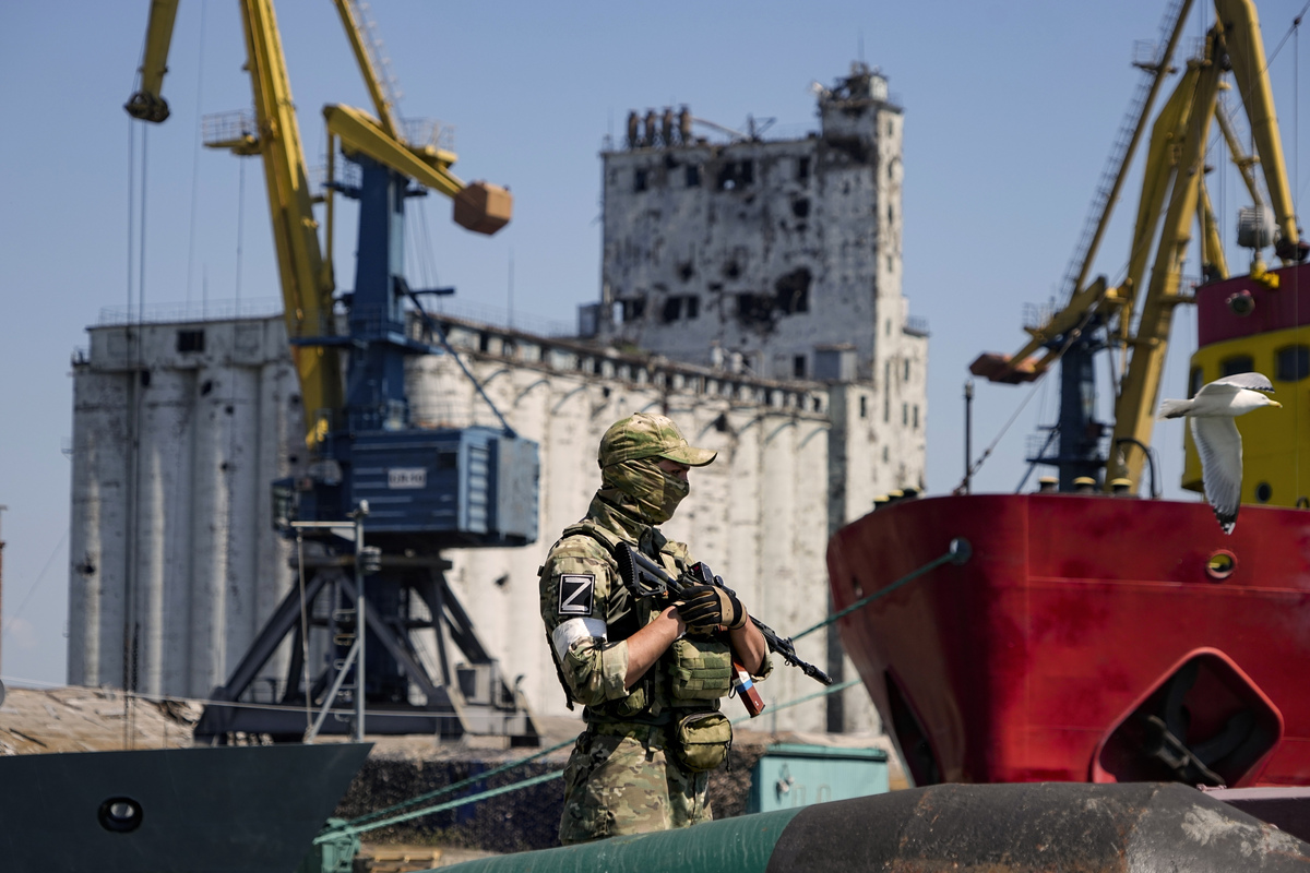 Российский солдат охраняет причал с зернохранилищем в районе Мариупольского морского порта, который недавно начал свою работу после ожесточенных боев в Мариуполе, 12 июня 2022 года