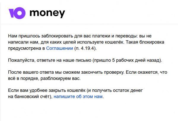 Иду в Яндекс.Почту (адрес кошелька - на Яндексе, это же бывший Яндекс.Деньги), там действительно письмо со стандартным текстом о том, что анализ моей активности им кажется подозрительным, что уж не использую ли я Юмани для чего-то незаконного или же, не дай бог, для коммерческой деятельности, что строжайшим образом запрещено?