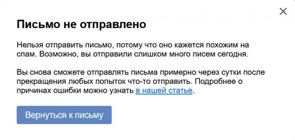 Но тут появилась неожиданная проблема. Отвечаю на их письмо, прикладываю налоговые декларации за пару лет, пытаюсь отправить. В ответ Яндекс.Почта сначала просит ввести капчу - уж больно ты, мил человек, подозрительный, - а после ввода капчи и вовсе получаю вот такое.