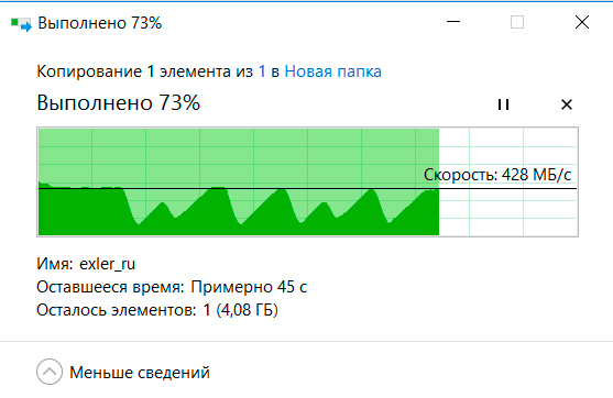 Как проверить реальную скорость? Да тупо на SSD-диске скопируйте какой-нибудь здоровенный файл в другую папку - все увидите. Вот копирование файла в 12 ГБ. В пиках поднимается до 450 МБ/с, средняя скорость получается где-то в районе 250 МБ/с. Что и требовалось доказать. А красивые цифири в табличке можно и "Фотошопом" нарисовать, делов-то.