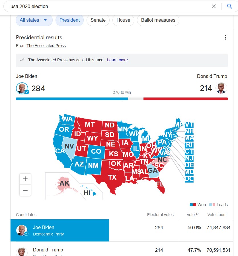 В чем, собственно, проблема, если Байден получил не только большинство выборщиков (как того требуют американские законы), но и абсолютное большинство голосов тоже? В отличие, например, от Трампа четырехлетней давности.