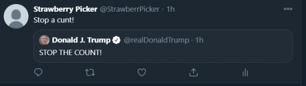 Если пол-страны не верят в честность выборов, то верящий в себя победитель просто обязан назначить перевыборы. Это ж универсальный рецепт от демократов. Да, внезапно речь не об Украине или Беларуси, а о самих США, но двойных стандартов быть не должно: если проигравшая сторона заявляет о массовых фальсификациях, их наблюдателей не подпускают к процессу подсчёта (это ж капец какой-то!), то надо знать международных наблюдателей, считать всё на камеру, только так!