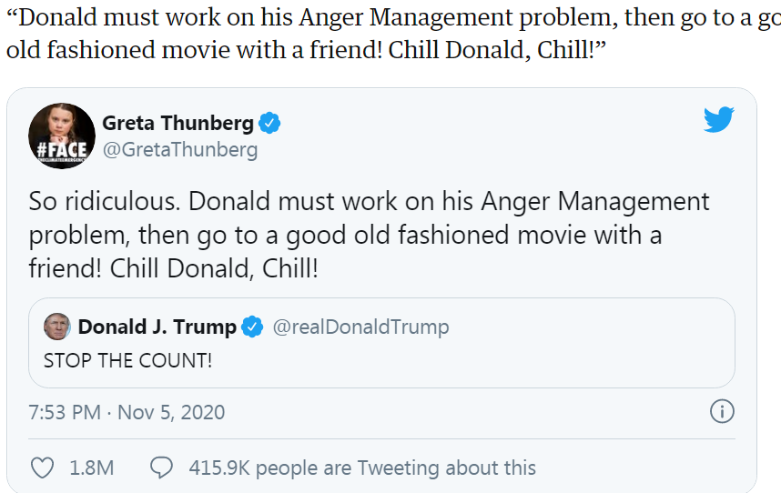 'Chill!': Greta Thunberg recycles Trump's mockery of her as he tries to stop votes.