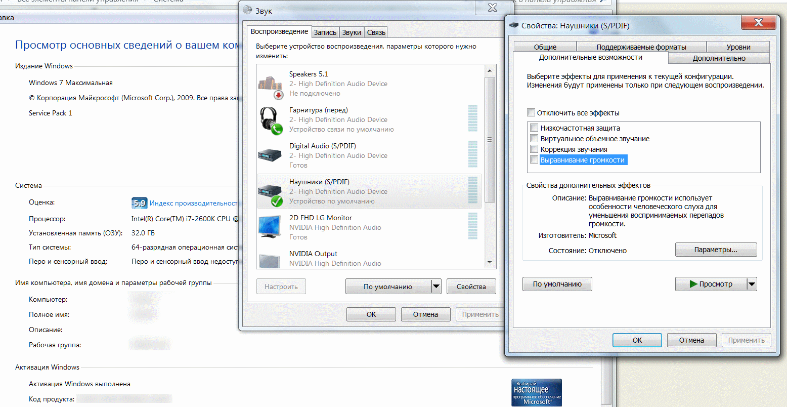 На устройстве правую кнопку мыши и там - Дополнительные эффекты, где выбрать "Выравнивание звука".