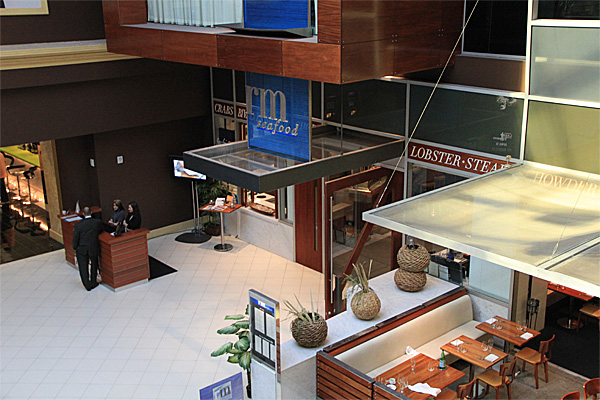 С большим удовольствием рекламирую ресторанчик в Вегасе специально для москвичей. Называется RM Seafood, находится в Mandalay Bay. Мы туда вчера зашли со старыми тульскими друзьями айтишниками (даже фидошниками) - просто типа как пообедать морепродуктами. Без затей. Правда, по меню было видно, что блюда недешевые - ну, 20 баксов блюдо, ну, 30. Дороговато, но для ресторана морепродуктов - вроде нормально. Были втроем. Заказали немного - три салата, пару порций устриц, три морепродуктов и компот. Ну и пару бутылок самого дешевого (для данного заведения) местного Шардоне из Напа Вэли.