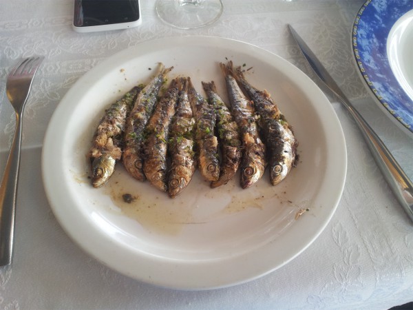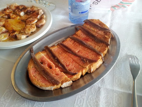 Традиционное каталонское блюдо - тосты с анчоусами. Хлеб намазывается соком помидоров, сверху - анчоус. Блюдо предельно простенькое, но эффективное.