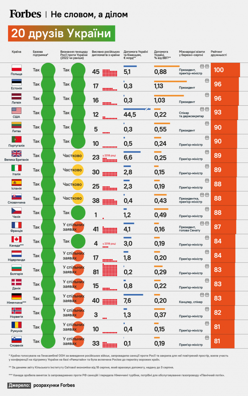 Первые места в обновленном рейтинге «Друзей Украины» заняли Польша, Эстония, Латвия, США, Литва. В предыдущей версии рейтинга, который Forbes составлял три месяца назад, первая пятерка была такова: Польша, США, Эстония, Латвия, Канада.