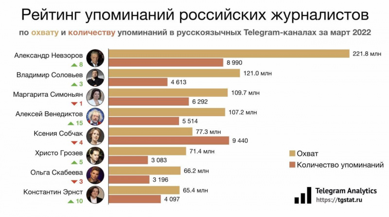 А тут сайт телеграм-аналитики Tgstat.ru опубликовал свое исследование по охвату и количеству упоминаний в русскоязычных телеграм-каналах за март 2022 году.