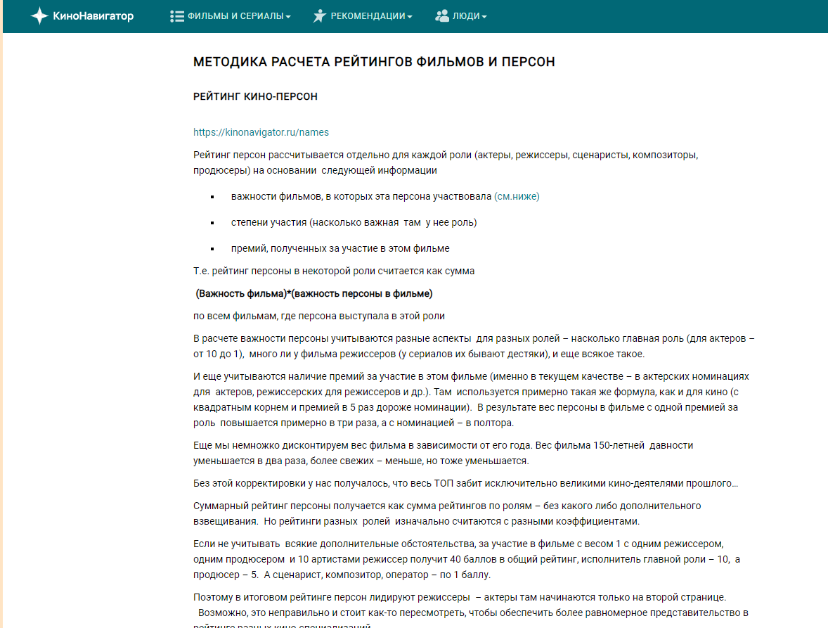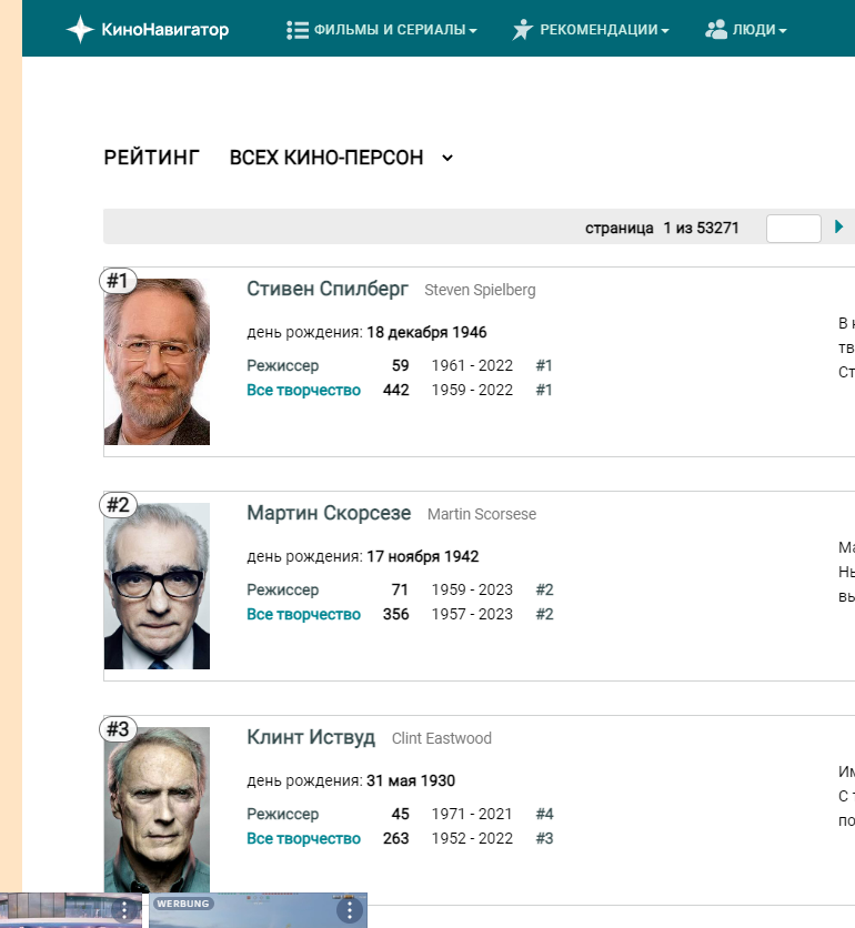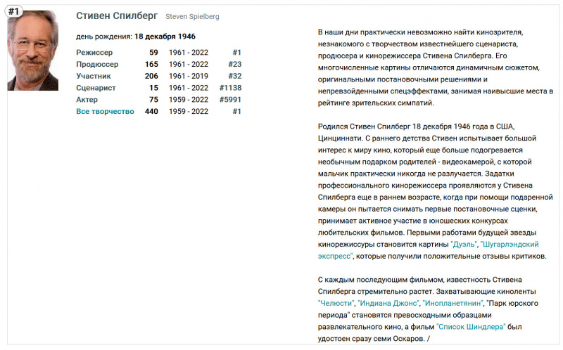 На сайте сервиса "Кинонавигатор" сделали рейтинг всех кино-персон - режиссеров, актеров, сценаристов, продюсеров. композиторов, операторов. Людей можно отбирать по группам - например, только актеров. Методику составления рейтинга они изложили на отдельной странице. При нажатии на конкретного человека из рейтинга выводятся различные сведения о нем и вся его фильмография.