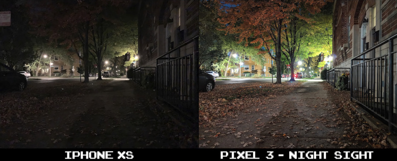 Вот, например, сравнение с iPhone XS, который, замечу, и сам хорошо снимает в плохих условиях освещения.