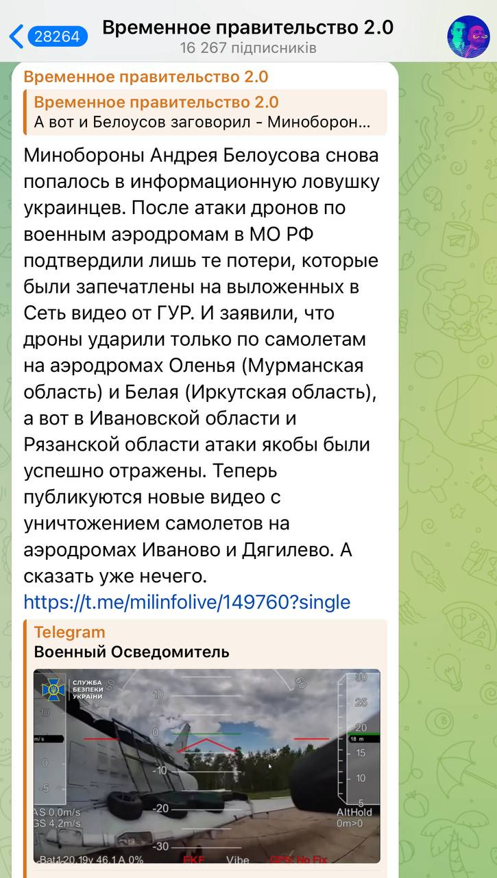 Сейчас было прям очень смешно. РФ требует четкой реакции Вашингтона и Лондона в связи с атаками Киева на стратегическую авиацию РФ. Прям в чистом виде "Враг коварно напал на наши самолеты, которые мирно бомбили их города".