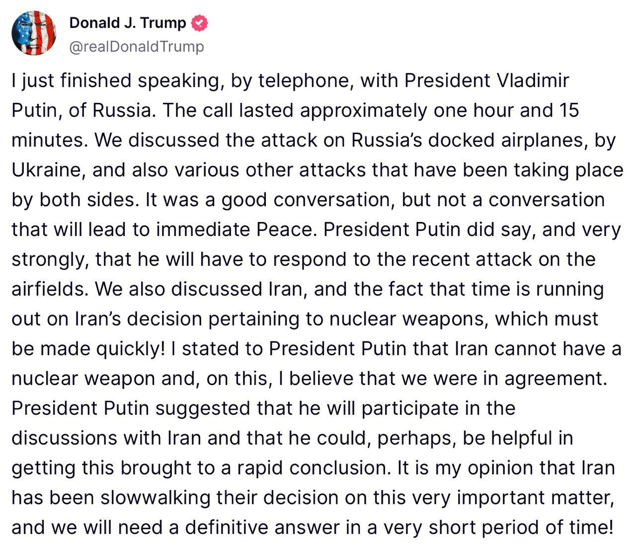 Небось, срок за который он наконец сможет понять хочет ли Путина мира - снова подвинет на две недели. Ведь текущие две недели уже начинают заканчиваться. А разговор то состоялся хороший!