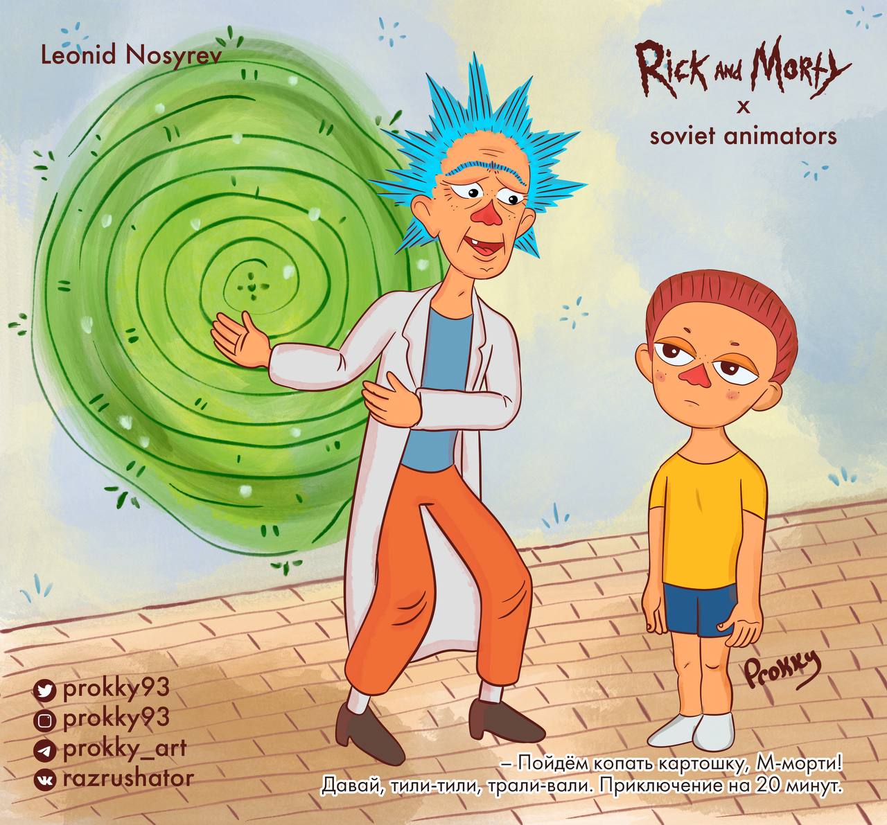 • Рик и Морти в стиле Леонида Носырева (род. 1937), автора фильмов «Антошка», «Рыжий, рыжий, конопатый», «Волшебное кольцо», «Mister Пронька» и многих других.