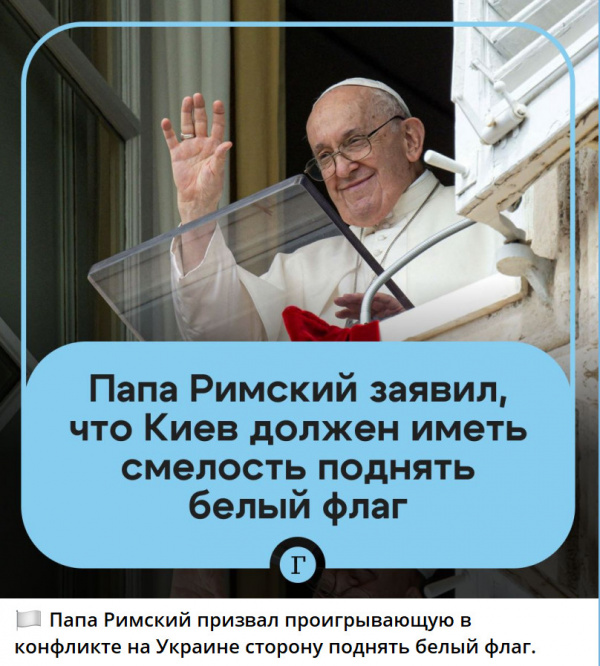 ❗️🗣️Папа римский на вопрос о войне в Украине заявил, что нужно иметь смелость поднять белый флаг. В Ватикане пояснили, что речь не шла о капитуляции Киева