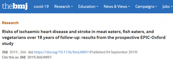 В течение 18 лет учеными проводились исследования влияния питания (мясоедов и вегетарианцев) на риски появления различных заболеваний сердца - "Risks of ischaemic heart disease and stroke in meat eaters, fish eaters, and vegetarians over 18 years of follow-up: results from the prospective EPIC-Oxford study".