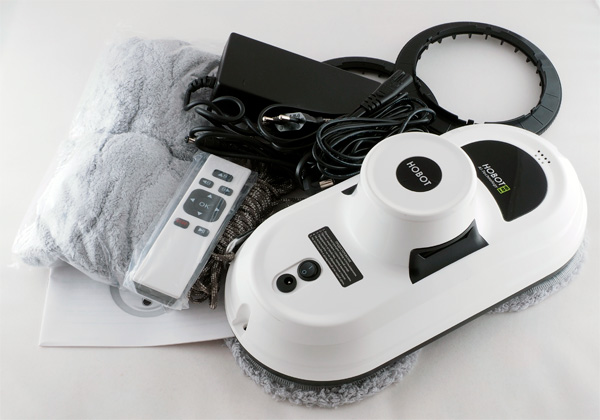 Комплект: сам робот с двумя салфетками и держателями к ним, 6 запасных салфеток с двумя держателями, адаптер питания со шнуром удлиннителем, пульт управления, страховочный трос, инструкция.