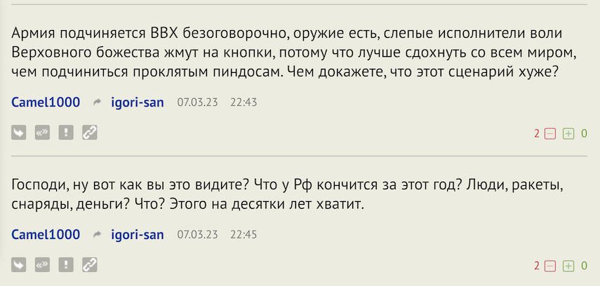 • Большинство россиян тупо не понимают смысла этой войны (пропаганда даже тут слажала на всю катушку)). Следовательно, не особо понимают, и ради чего они вдруг должны не только отдавать мужиков на фронт, но даже и сами "меньше жрать". Пока просто тупо подчиняются, но это ненадолго. Риск социального взрыва весьма велик.