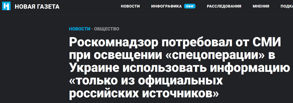 «При подготовке своих материалов и публикаций, касающихся проведения специальной операции в связи с ситуацией в Луганской народной республике и Донецкой народной республике, они обязаны использовать информацию и данные, полученные ими только из официальных российских источников», — говорится в заявлении РКН.