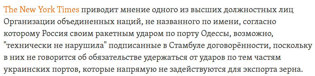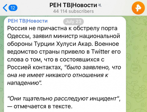 Россия не имеет никакого отношения ко вчерашнему обстрелу одесского порта, произошедшему ровно на следующий день после подписания договоренностей в Турции. Это венерианские скалозубы, кто же еще?