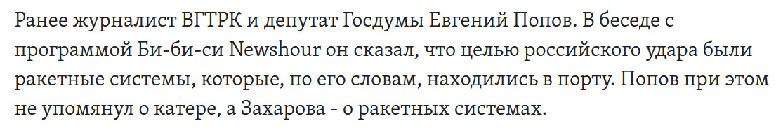 В сообщении ведомства говорится, что удар был нанесен высокоточными ракетами большой дальности. Целью российский армии якобы являлся находившийся в доке порта украинский военный корабль и склад американских противокорабельных ракет Harpoon. «Также выведены из строя производственные мощности предприятия по ремонту и модернизации корабельного состава военно-морских сил Украины», — пишет Минобороны. (Отсюда.)