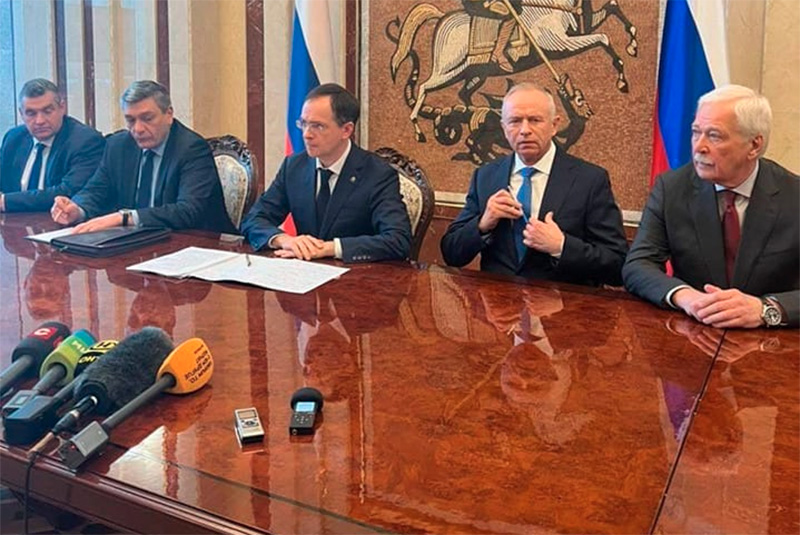 Российская делегация на фейковых российско-украинских "переговорах" в Гомеле. "Группа аккордных дебилов", возглавляемых Мудинским. Посидят немного и обратно в Мордор поедут. Никакие украинцы с этой группой убогих разговаривать, конечно, не собираются.