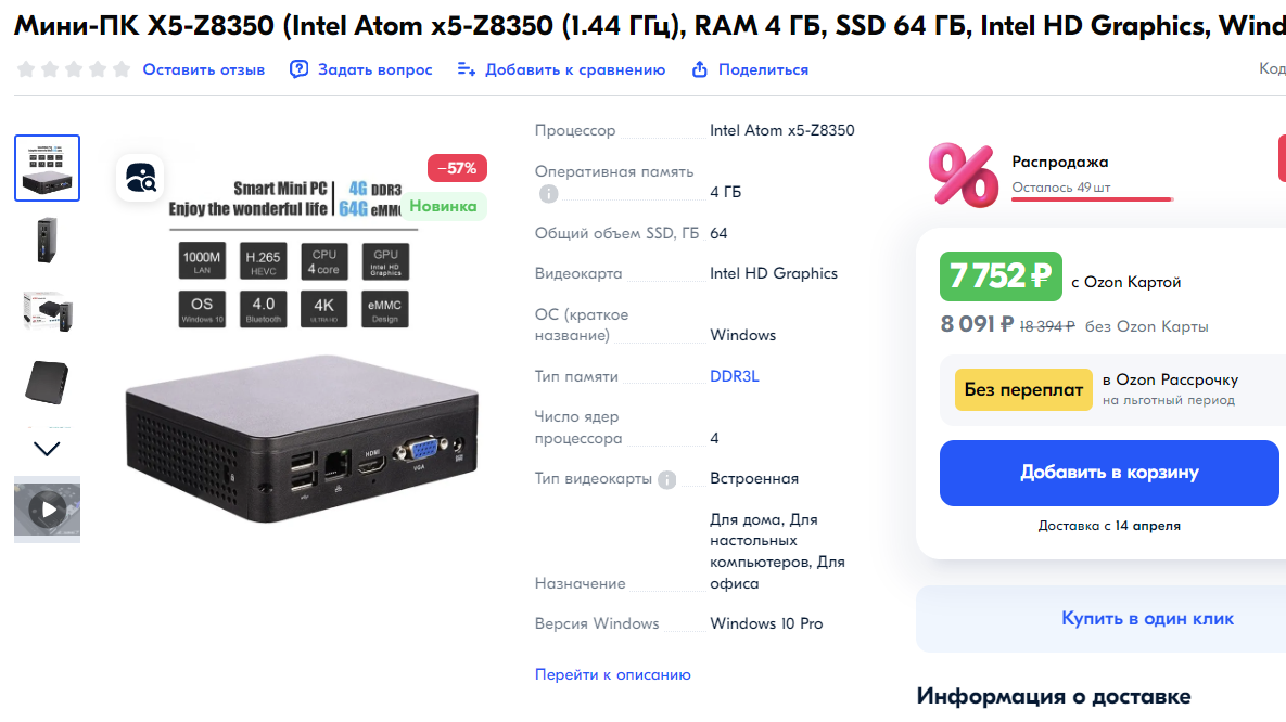 На Озоне (Озоне, даже не Али!) нашли идентичный аппарат, заявленный как миниПК по цене 8 тыс рублей. Менее 100 баксов, Карл! В 6 раз дешевле!