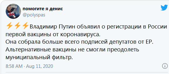 «Насколько мне известно, сегодня утром зарегистрирована, впервые в мире зарегистрирована вакцина против новой коронавирусной инфекции»,— сказал господин Путин на совещании с членами правительства. По словам российского президента, одна из его дочерей уже сделала прививку.