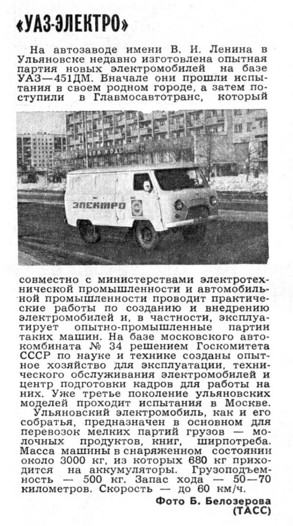 Это, конечно же, совершенно новое слово в науке и технике - электрическая "Буханка". Ой, нет, похоже, что не очень новое слово - ТАСС уже сообщал в 1977 году, Маск уже трепетал, как осенний лист на ветру, хотя ему тогда и было всего 6 лет. Но уже трепетал, мы знаем!