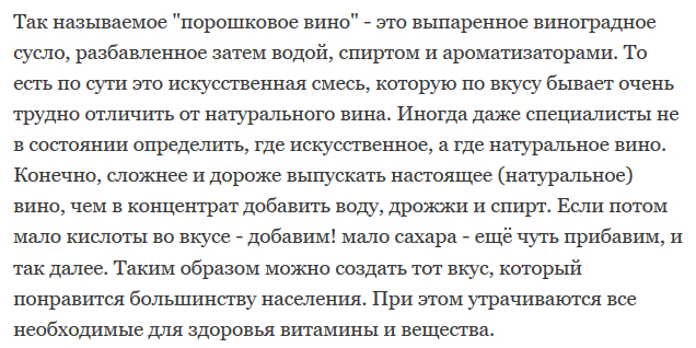"Без всякой морали, бутылка «вина» из порошка проиграет конкуренцию дешёвому натуральному, но низкокачественному вину ....., подправленному натуральными добавками (такими как вакуум сусло или танины в порошке - таки да, щипотка порошка в дешёвом жидком виноматериале)." Это ли не порошковое вино? 😄
