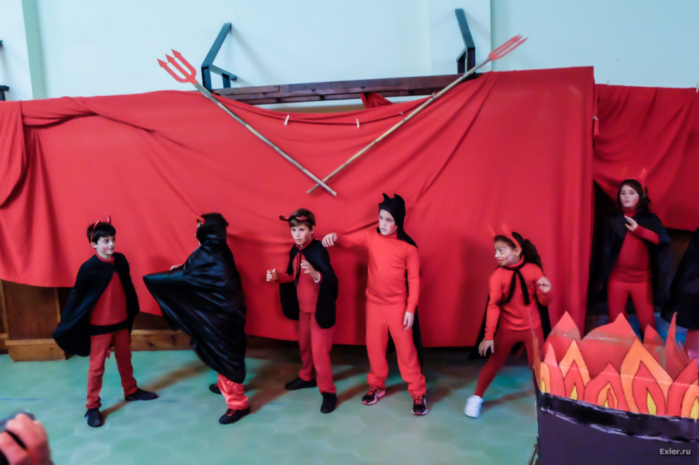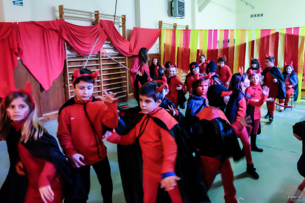 В спортзале, как и полагается, Преисподняя. Черти скачут туда-сюда под зажигательную музыку на радость родителям.