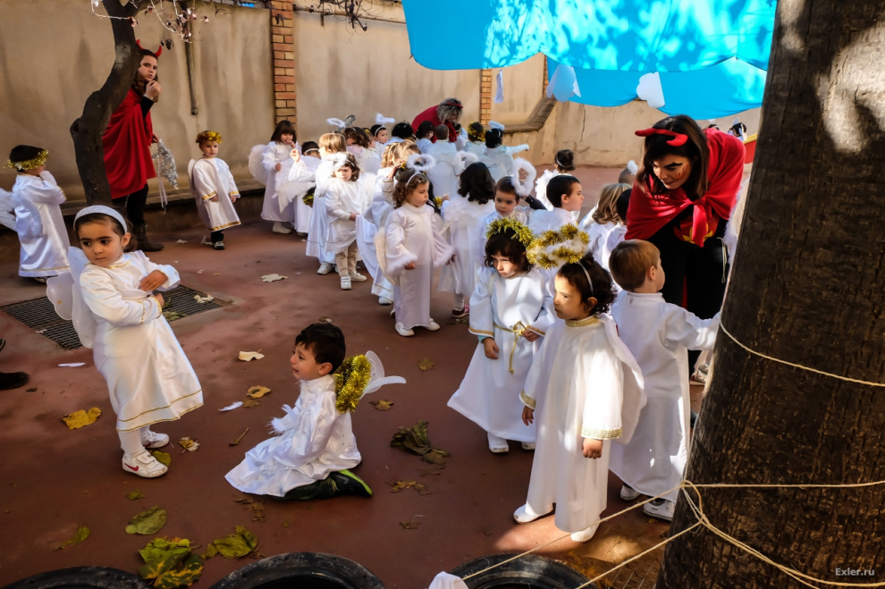 Ну традиция, не в одной католической Испании, кстати. На британщине тоже под новый год в младших классов всегда ставится Nativity Play, а в старших проводится Carol concert. И в частных школах, и в государственных и в церковных. У нас в свое время утренники были со Снегуркой и Дедом Морозом, а у них с осликами, пастухами и звездами. Праздник-то как бэ тематический, не?