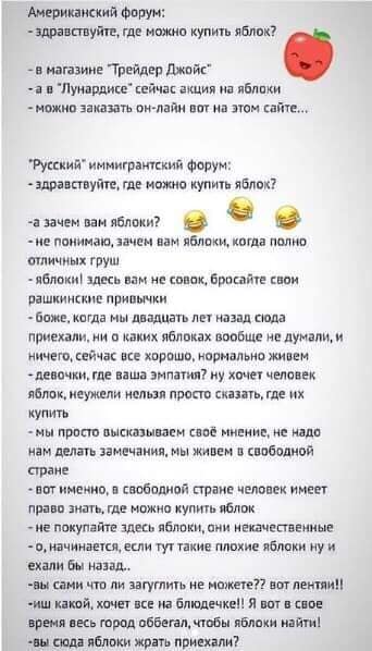 Здесь еще не хватает типичного "яблоки здесь безвкусные, искусственные. Я свои на праперти выращиваю, с веточки!"