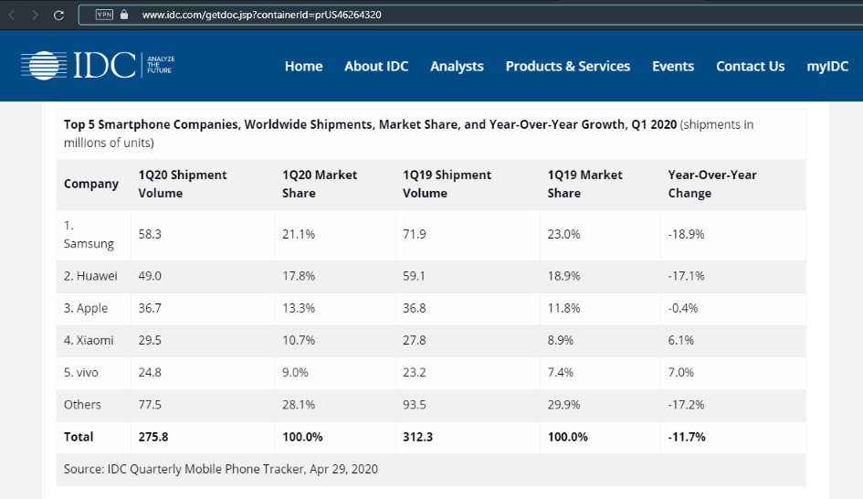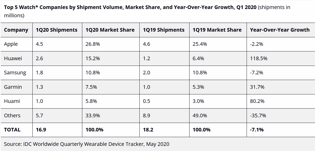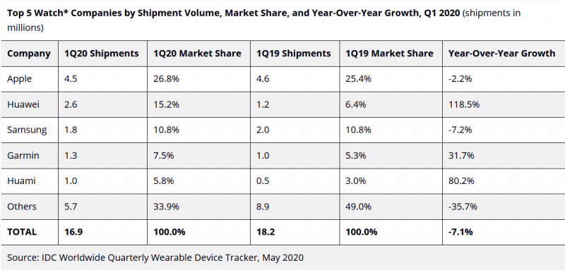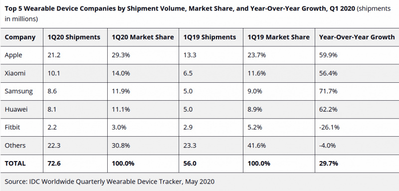 Аналитическая компания IDC опубликовала отчеты о состоянии рынка носимой электроники (смартфоны, планшеты, часы, фитнес-браслеты) в I квартале 2020 года.