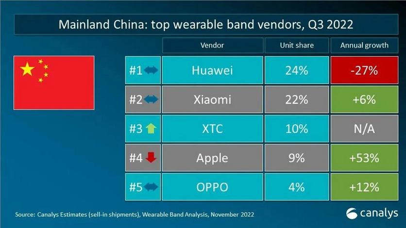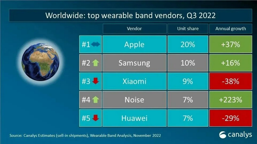 Крупнейшим поставщиком носимых устройств в мире остаётся Apple, на долю которой приходится 20% всех реализуемых устройств. В сравнении с третьим кварталом 2021-го компания улучшила свои показатели на 37%. На второе место поднялась Samsung, обогнав Xiaomi, — у первой за год отмечается прирост в 16%, а у второй поставки снизились на 38%. Внезапно в топ-5 ворвался индийский бренд Noise, чьи показатели выросли на впечатляющие 223%. На пятом месте разместилась HUAWEI с долей в 7% и снижением поставок на 29%. (Отсюда.)