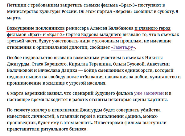 «Деньги есть, люди выделили из ритуального бизнеса. Идея понравилась - третий «Брат», продолжение. Там будет очень закрученный сюжет и развязка такая, что все офигеют, как я надеюсь. Будет группа «На-На» писать саундтрек, это уже точно, Бари Алибасова тоже снимем в роли. Договорились с Останкинской телебашней по поводу локации, они дали добро первоначально, не отказались. По поводу локации - там будет сидеть киллер, Джигурда, и отстреливать известных персонажей ключевых, Пугачеву с Галкиным. Понимаете, заказ поступил, и вот он будет их отстреливать. Брат ему будет препятствовать, а Дацик будет играть монаха-проповедника. Вот такая интрига, можно сказать», - заключил Барецкий.