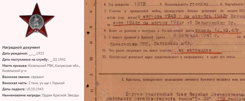 Дедушка - папин отец - был стрелок-радист танка Т34, в 1943 в Белоруссии был тяжело ранен. Награжден орденом Красной Звезды.