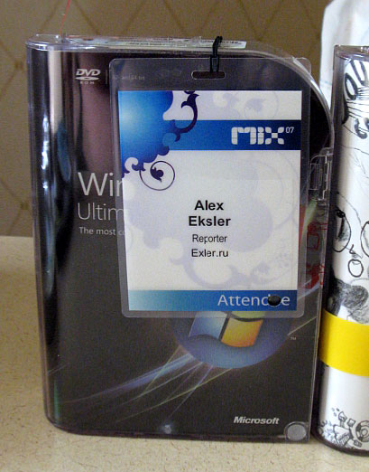 P.S. Предвосхищая вопрос, почему баджик висит на Vista... Microsoft Vista Ultimate и Microsoft Expression Studio там выдавали всем участникам. А баджик на коробку с Vista я повесил для фотографирования, потому что на ней баджик висел вертикально, и его было удобно щелкнуть.