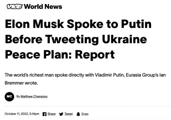 Теперь стало понятно, откуда растут уши у этих идиотских и истеричных постов Маска о том, что Украина должна немедленно отдать Путину свои территории, провести там какие-то референдумы, да и вообще - типа поцеловать Путина в жопу. Как выяснилось, Маск просто купился на путинский ядерный шантаж. Развели Маска как мальчика и даром. Путин на этот ядерный шантаж много кого развёл. А Маску Марс колонизировать и всё такое. И как тут колонизировать, когда термоядерная война может начаться? Значит, Украина немедленно должна капитулировать, чтобы Путин не шваркнул ядрёной бонбой. Вперёд, Украина, сдаваться, ать-два.