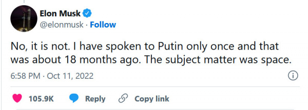 Upd: Маск опроверг то, что он недавно разговаривал с Путиным. Но это как-то ни на что не влияет в данном случае. Заявления свои идиотские он делал? Делал. Ну и всё.