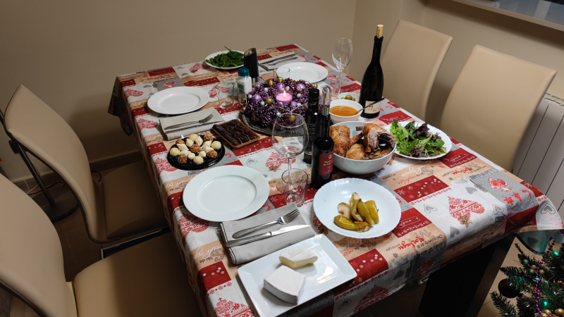 Отметили, конечно, местные традиции нужно уважать. Стол просто ломился: утка с яблоками, три листика салата, пять листиков шпината, сыры и финики. Юный Каталан получил свою законную праздничную пиццу.